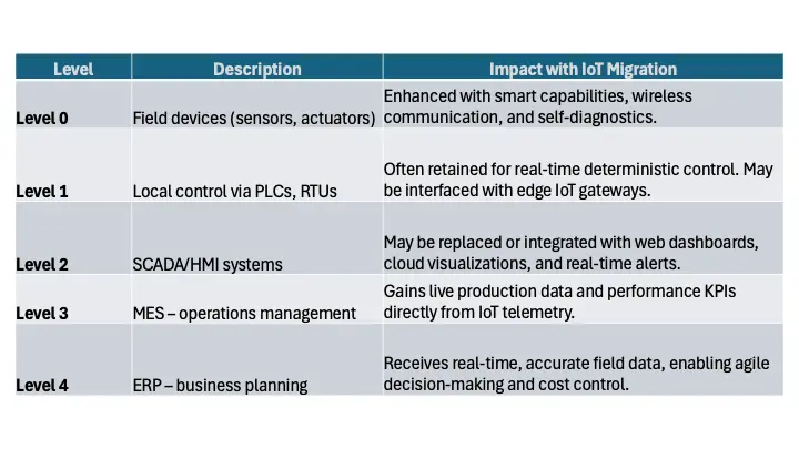 In essence, Level 0 and 1 remain the foundation, but they become more intelligent and interoperable. IoT augments or replaces functions from Level 2 upwards, depending on operational goals.